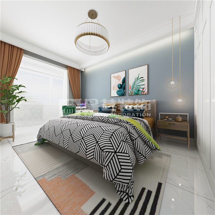主臥搭配清爽麗人,希望回家的每一天都能有好心情,夫妻和睦,家庭圓滿,是每一個人的祈求,床頭的燈帶弱化了筒燈的刺眼,窗簾配飾大膽而新穎\