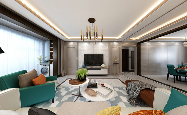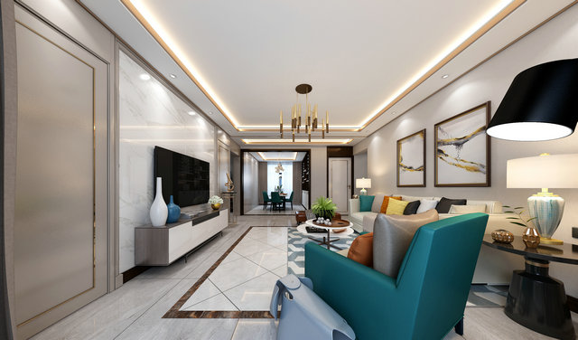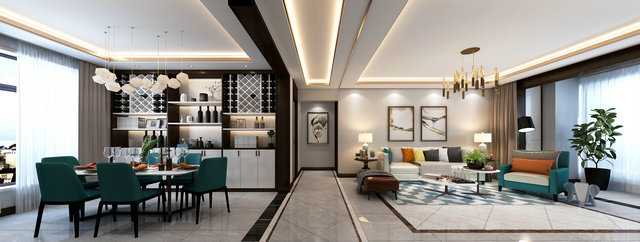 藍(lán)綠色作為空間的主題色,在空間中得到充分體現(xiàn)。600*1200灰色石材紋理地磚覆蓋整體空間,紋理本身成為裝飾的一部分。質(zhì)感輕奢的皮質(zhì)沙發(fā)是客廳的視覺中心,輕松閑適的氛圍也給人以生機(jī)勃勃的力量。