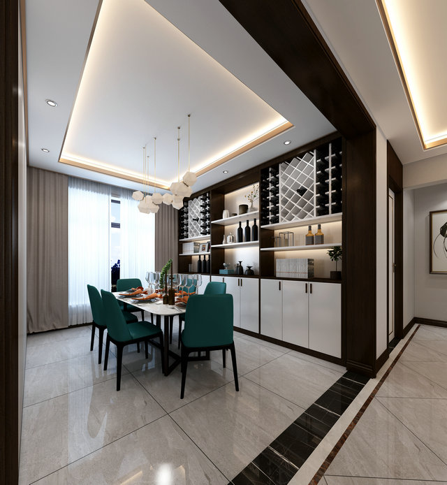 餐廳延續(xù)了客廳的藍(lán)綠基調(diào),定制設(shè)計(jì)的不銹鋼與大理石組合的餐桌、木質(zhì)布椅、套色的酒柜等,為空間增添更多趣味的元素,傳遞出主人不拘泥于常規(guī)、努力求變的生活態(tài)度。