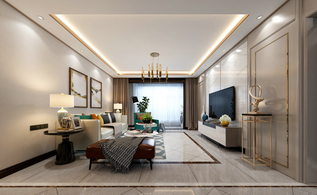 客廳的電視背景墻,香檳金皮質(zhì)硬包與白色墻板形成搭配,以柔和分明的線條勾勒生活質(zhì)感,頂部加以金色不銹鋼條點(diǎn)綴,豐富多樣的飾品擺件詮釋著最輕奢的都市生活格調(diào)。