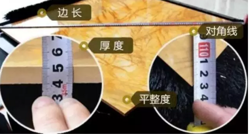 用卷尺測量瓷磚的邊長、厚度有無差異。還要測量磚的兩條對角線,看看對角線是否相等。